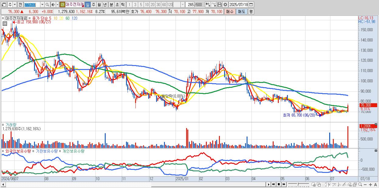 - 대주전자재료 (77,300원 ▲ 10.43% , 시총: 11,966억, 거래량: 733,618, 거래대금:549억)