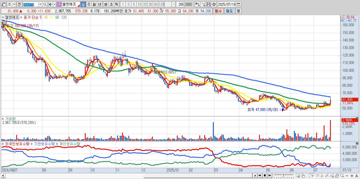 - 엘앤에프 (62,200원 ▲ 12.89% , 시총: 22,589억, 거래량: 1,743,058, 거래대금:1,069억)