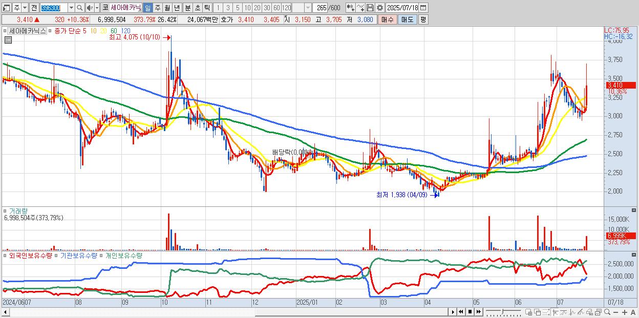- 세아메카닉스 (3,410원 ▲ 10.36% , 시총: 903억, 거래량: 6,998,504, 거래대금:241억)