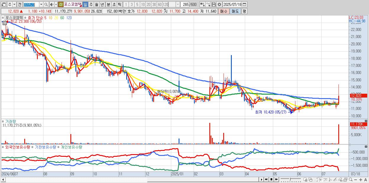 - 포스코엠텍 (13,160원 ▲ 13.06% , 시총: 5,480억, 거래량: 6,375,109, 거래대금:873억)