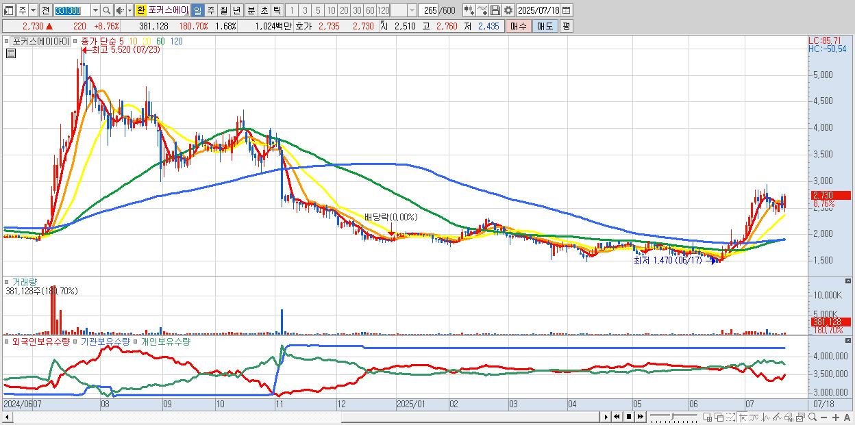 - 포커스에이아이 (2,730원 ▲ 8.76% , 시총: 620억, 거래량: 381,128, 거래대금:10억)