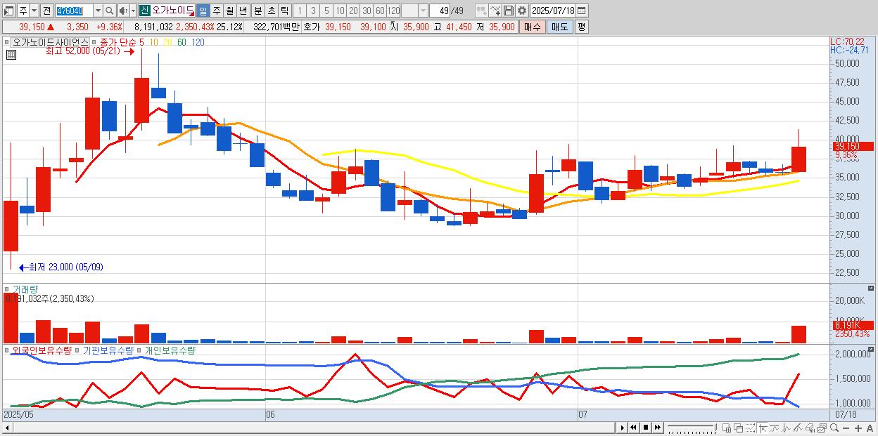 - 오가노이드사이언스 (40,200원 ▲ 12.29% , 시총: 2,632억, 거래량: 4,002,945, 거래대금:1,581억)