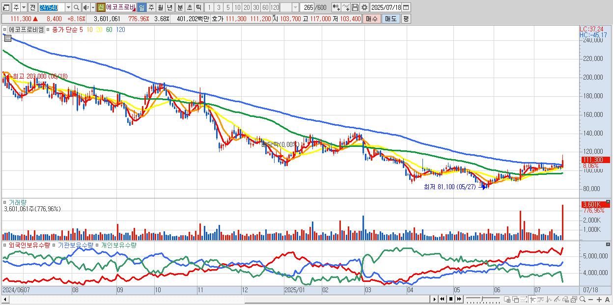 - 에코프로비엠 (112,200원 ▲ 9.04% , 시총: 109,733억, 거래량: 2,128,747, 거래대금:2,373억)