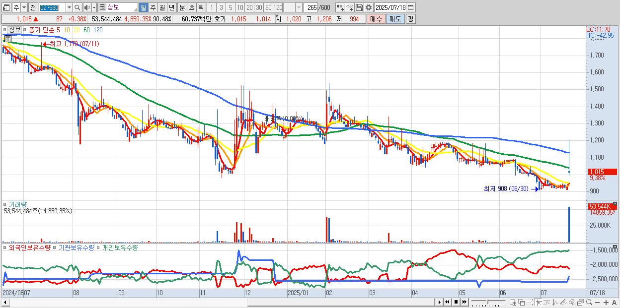 - 상보 (1,015원 ▲ 9.38% , 시총: 601억, 거래량: 53,544,484, 거래대금:607억)