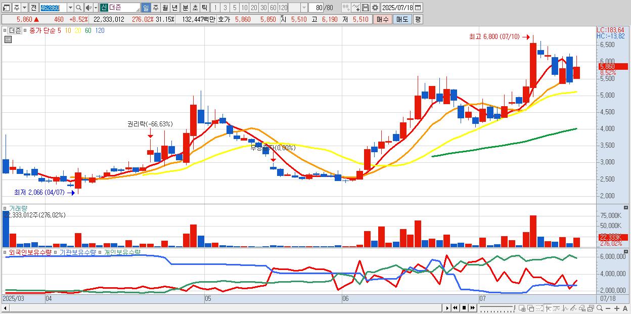 - 더즌 (5,860원 ▲ 8.52% , 시총: 4,201억, 거래량: 22,333,012, 거래대금:1,324억)
