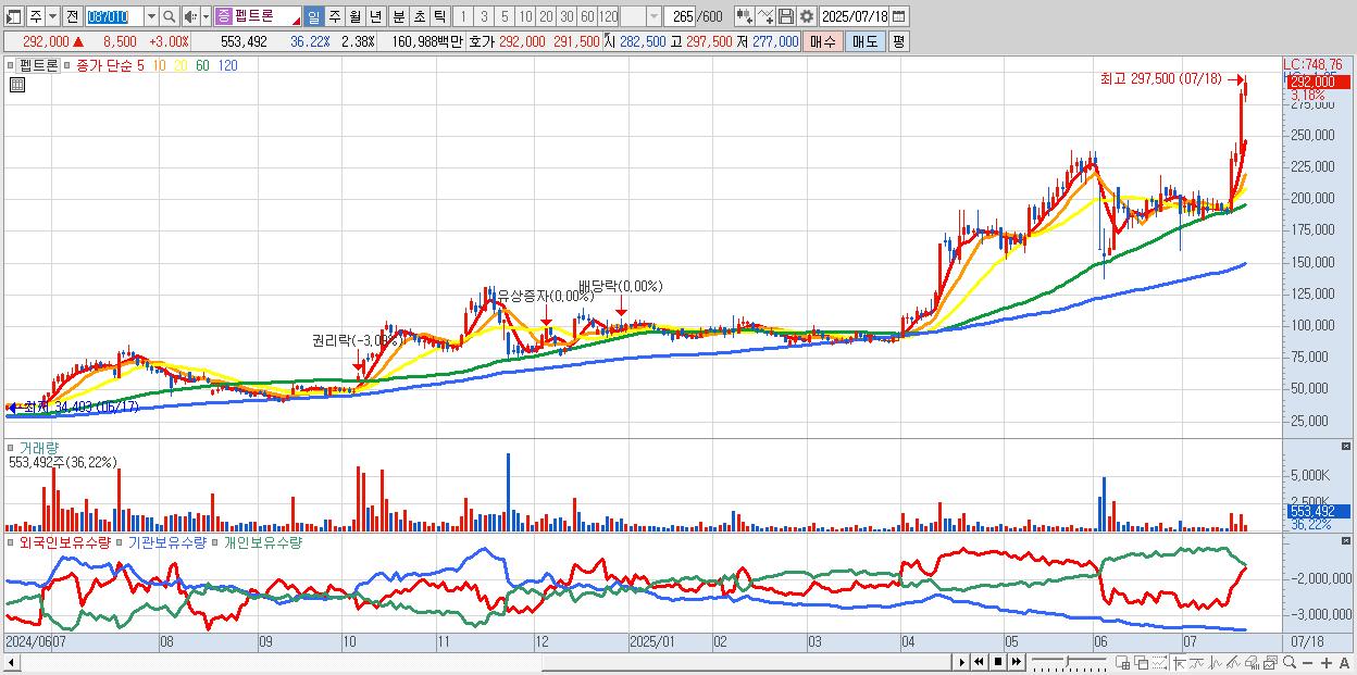 - 펩트론 (294,500원 ▲ 3.88% , 시총: 68,611억, 외국인 순매수 거래금:237억)