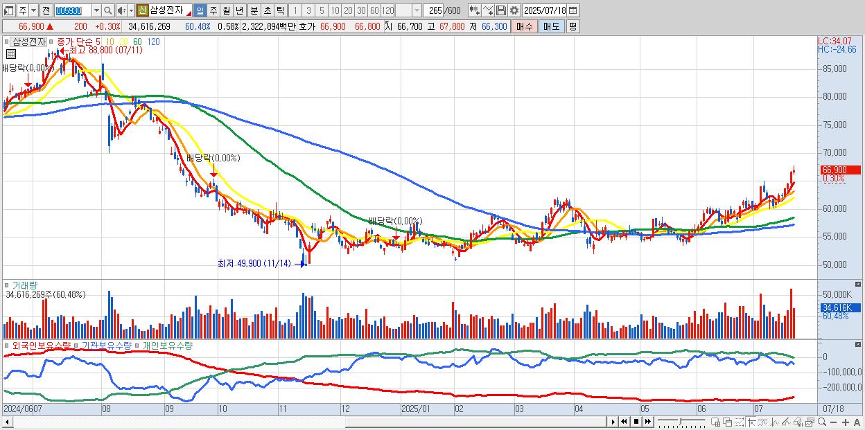 증시 활황세에도 나 홀로 지지부진하던 삼성전자 주가가 기지개를 켜고 있다. 이재용 회장의 사법 리스크 해소와 고대역폭메모리(HBM) 공급 기대, 저평가 매력 등이 부각된 영향이다. 외국인 투자자의 집중 매수에 힘입어 ‘7만전자’ 탈환을 눈앞에 뒀다는 분석이 많다. 18일 유가증권시장에서 삼성전자는 0.6% 오른 6만7100원에 마감했다. 장중 6만7800원…