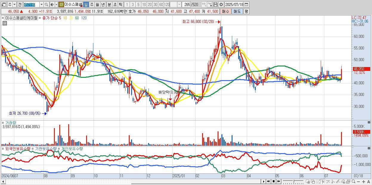 - 이수스페셜티케미컬 (45,950원 ▲ 11.66% , 시총: 13,881억, 외국인 순매수 거래금:100억)