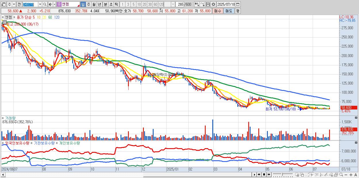 - 엔켐 (58,800원 ▲ 5.57% , 시총: 12,774억, 외국인 순매수 거래금:61억)