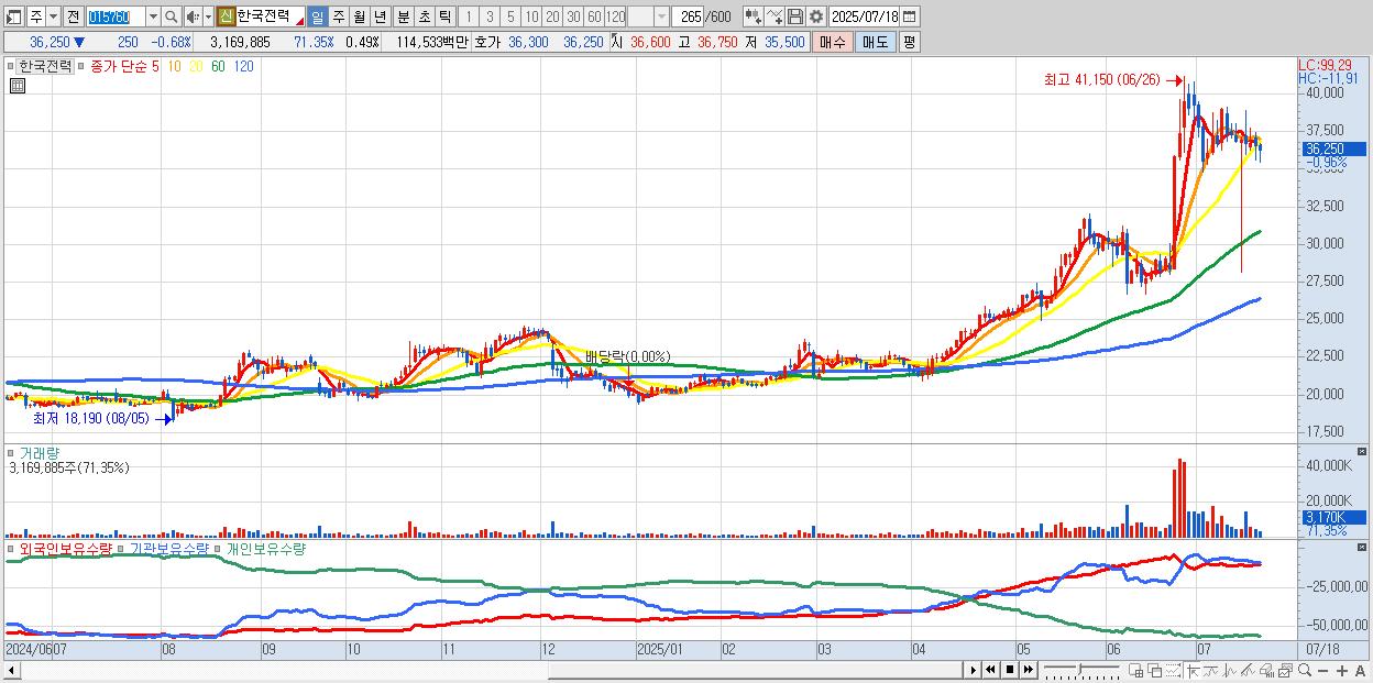 - 한국전력 (36,250원 ▼ -0.68% , 시총: 232,712억, 외국인 순매수 거래금:118억)