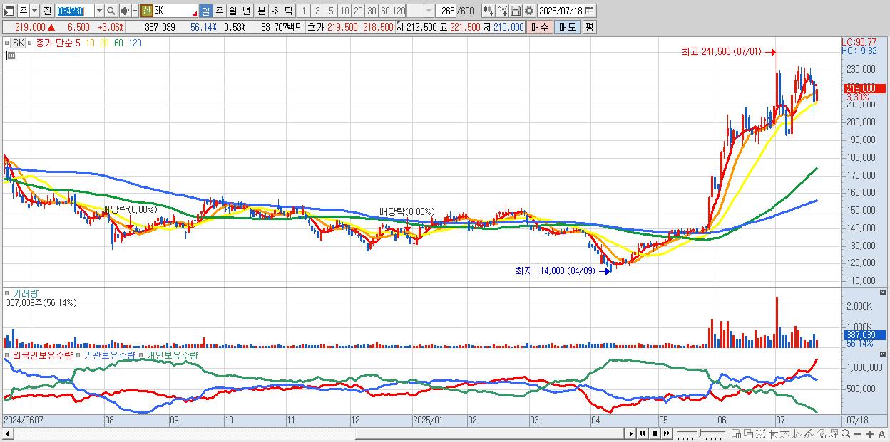- SK (221,500원 ▲ 4.24% , 시총: 160,593억, 외국인 순매수 거래금:193억)