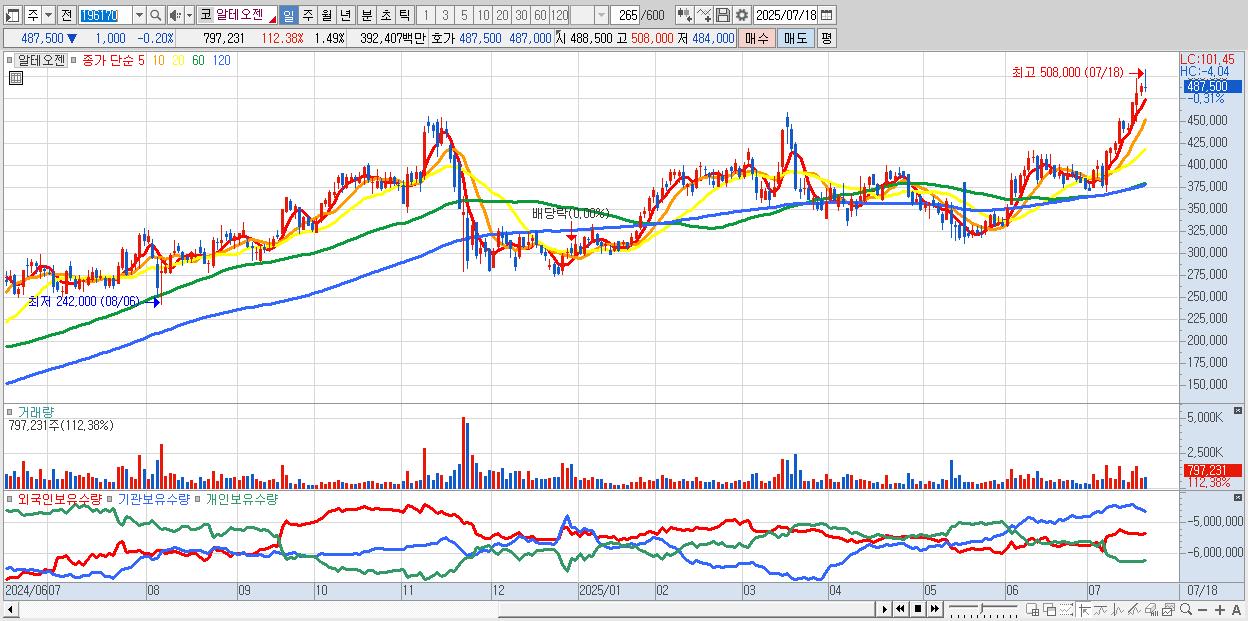 - 알테오젠 (490,000원 ▲ 0.31% , 시총: 261,978억, 외국인 순매수 거래금:101억)