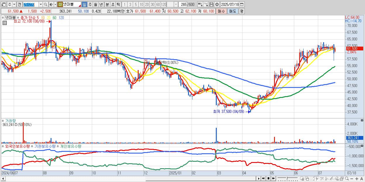 - 넷마블 (61,200원 ▲ 2% , 시총: 52,604억, 외국인 순매수 거래금:62억)