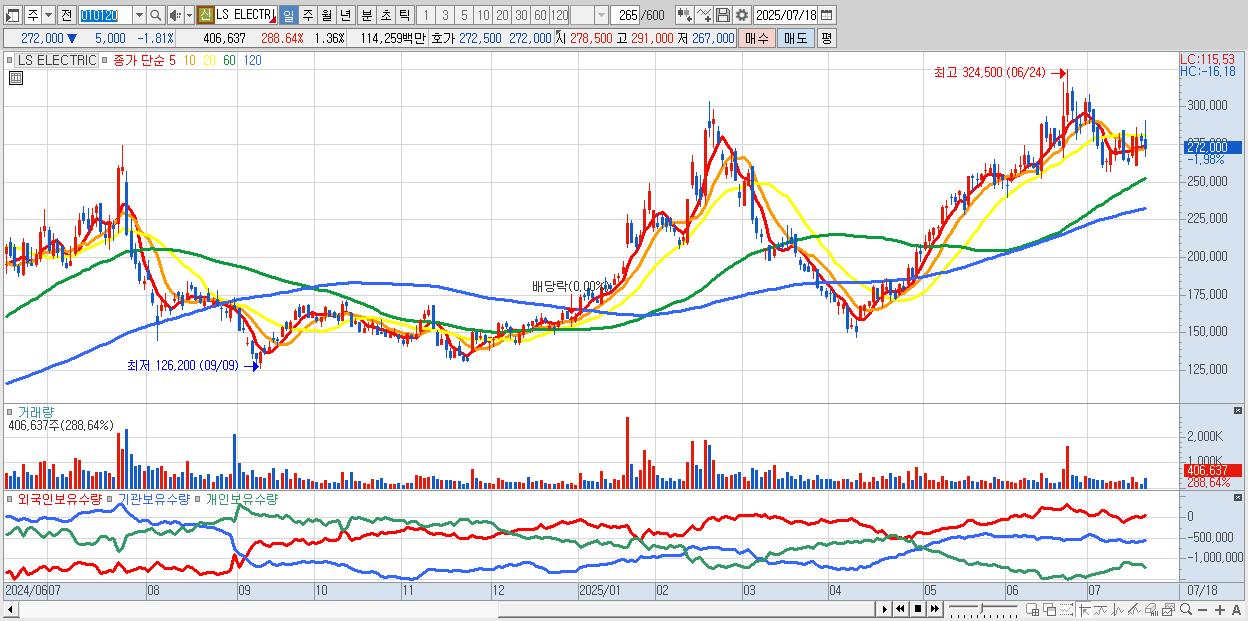 - LS ELECTRIC (286,500원 ▲ 3.43% , 시총: 85,950억, 외국인 순매수 거래금:149억)