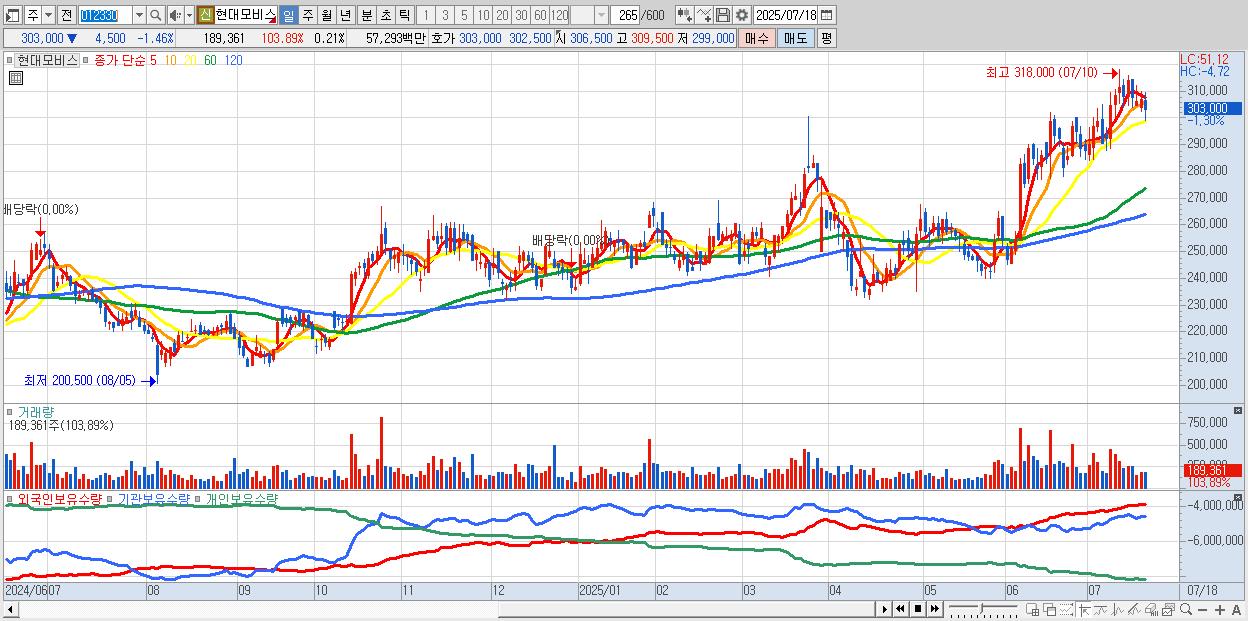 - 현대모비스 (303,000원 ▼ -1.46% , 시총: 278,139억, 외국인 순매수 거래금:56억)