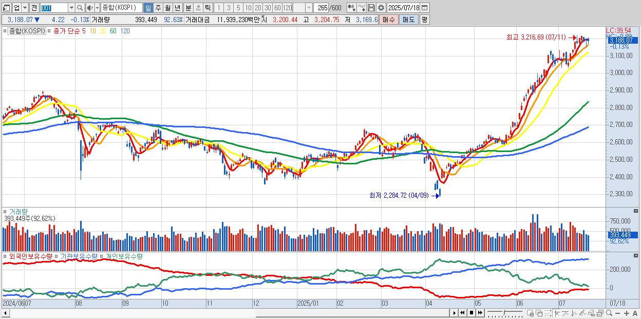 | 07/17 | 3,192.29 | ▲0.19% | -3,356억 | 493억 | 1,583억 | 1,279억 |