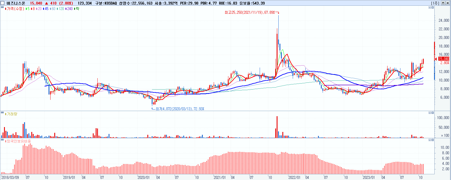 - 비즈니스온 (15,040원 ▲ 2.8% , 시총: 3,392억, 거래량: 123,433, 거래대금:18억, KOSDAQ)