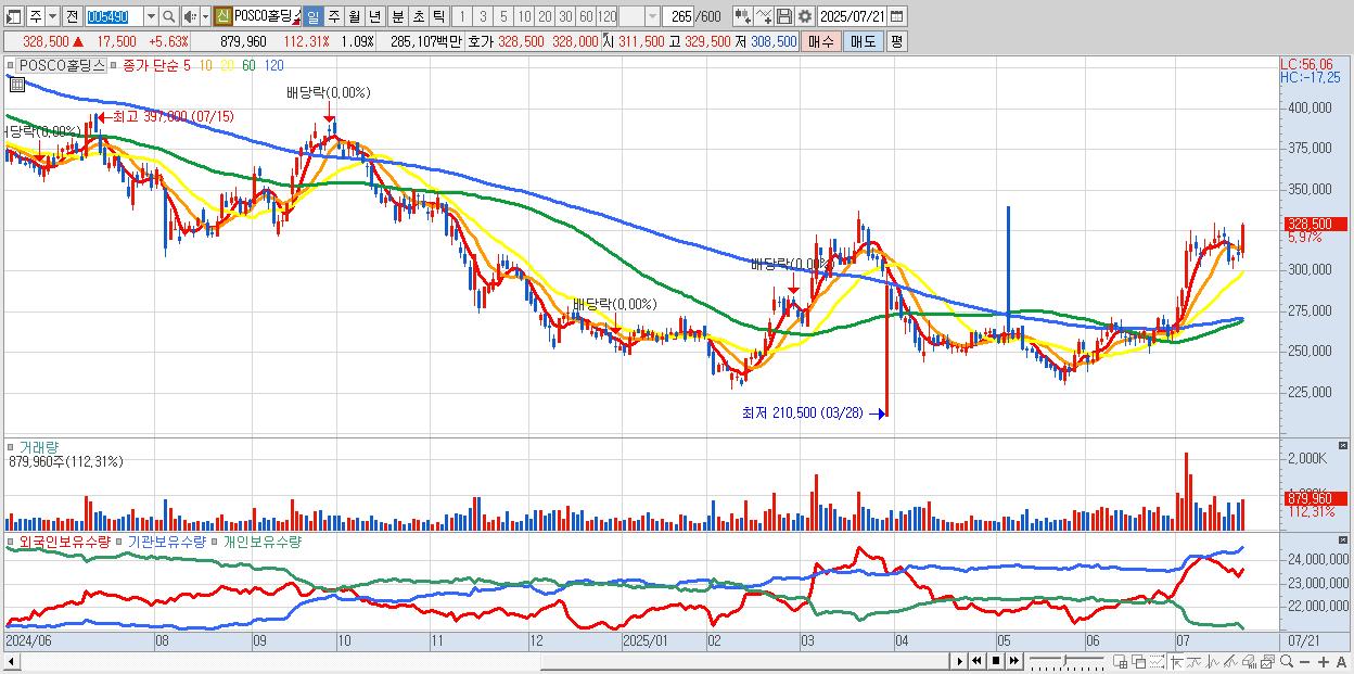 - POSCO홀딩스 (327,000원 ▲ 5.14% , 시총: 264,651억, 외국인 순매수 거래금:357억)
