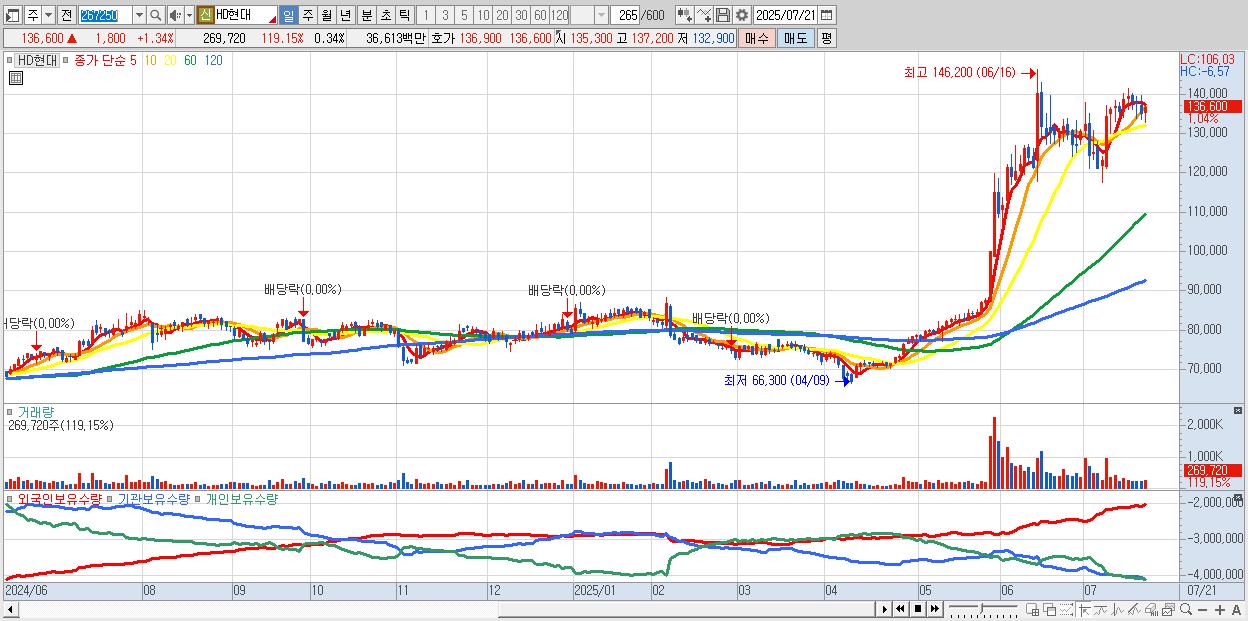 - HD현대 (137,200원 ▲ 1.78% , 시총: 108,379억, 외국인 순매수 거래금:132억)