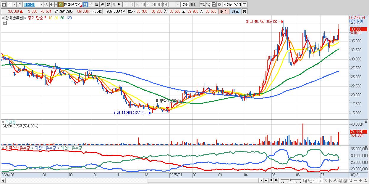 - 한화솔루션 (37,900원 ▲ 7.37% , 시총: 65,147억, 외국인 순매수 거래금:821억)