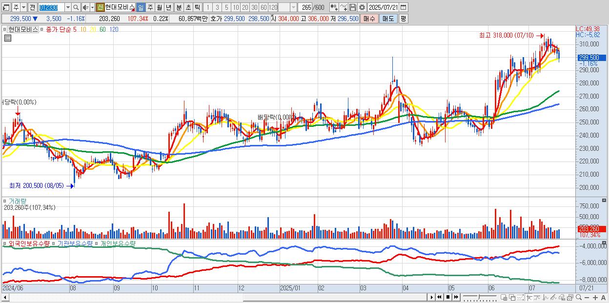 - 현대모비스 (299,000원 ▼ -1.32% , 시총: 274,467억, 외국인 순매수 거래금:164억)