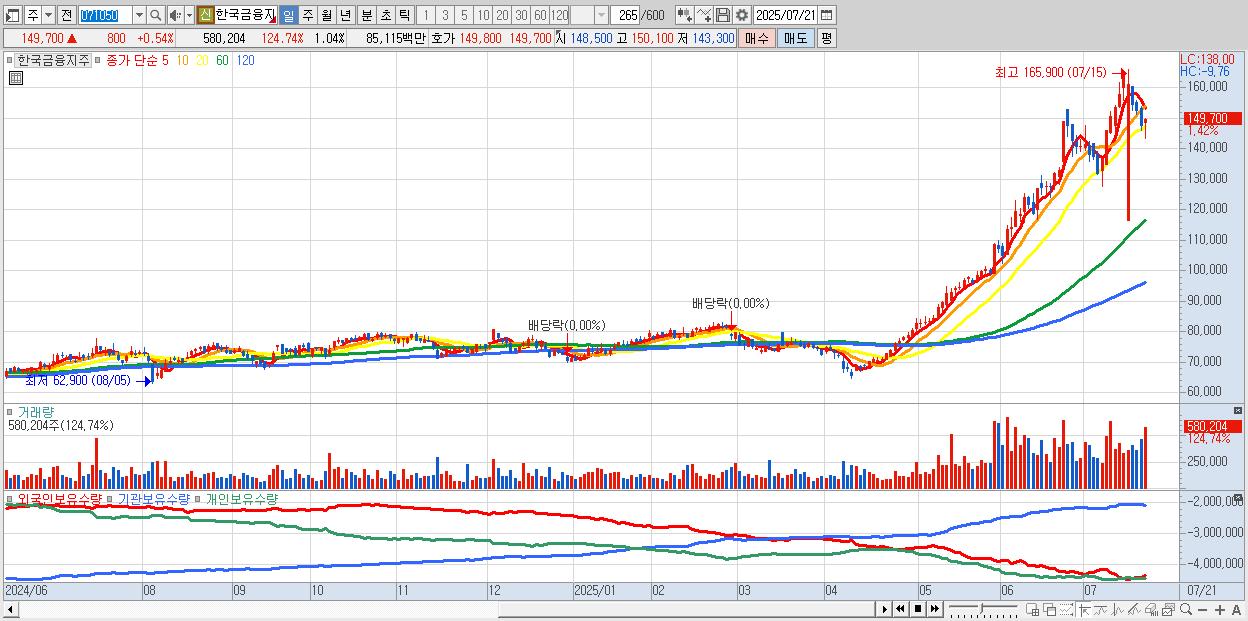 - 한국금융지주 (148,600원 ▼ -0.2% , 시총: 82,809억, 외국인 순매수 거래금:114억)