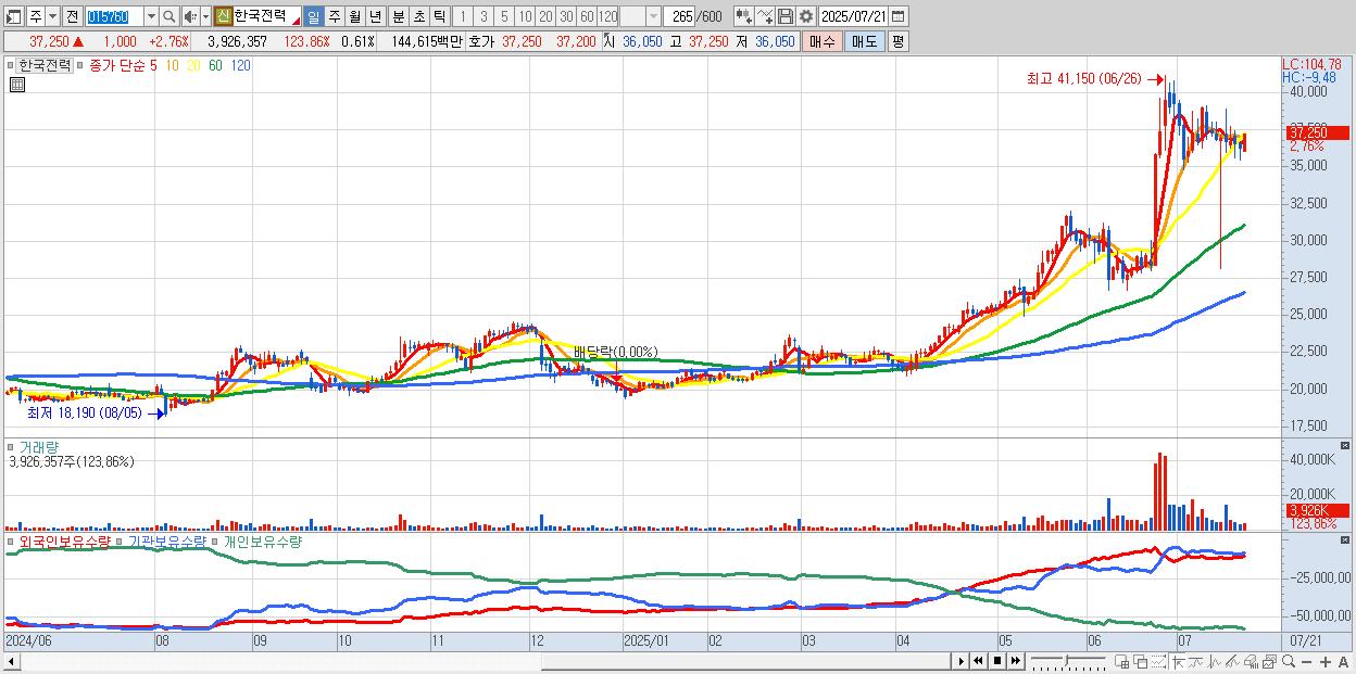 - 한국전력 (37,150원 ▲ 2.48% , 시총: 238,490억, 외국인 순매수 거래금:192억)