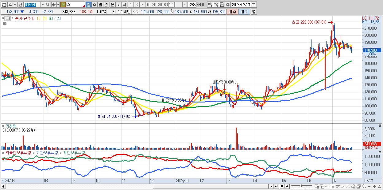- LS (178,500원 ▼ -2.57% , 시총: 57,477억, 외국인 순매수 거래금:116억)