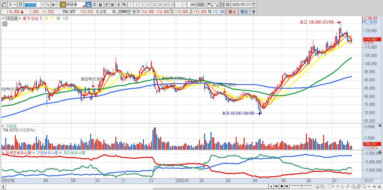 - KB금융 (115,000원 ▲ 1.41% , 시총: 438,681억, 외국인 순매수 거래금:253억)
