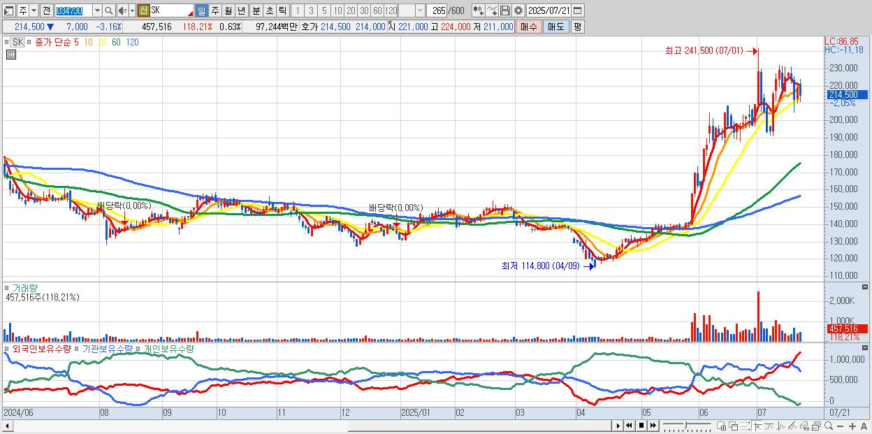 - SK (212,500원 ▼ -4.06% , 시총: 154,068억, 외국인 순매수 거래금:120억)
