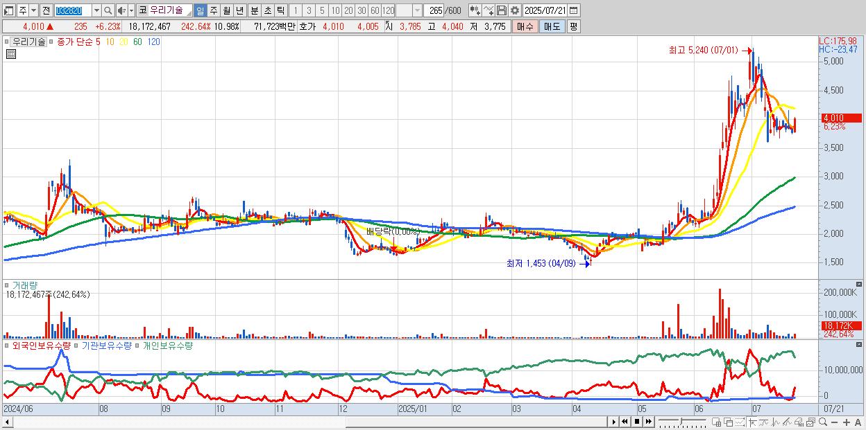 - 우리기술 (4,010원 ▲ 6.23% , 시총: 6,638억, 외국인 순매수 거래금:101억)