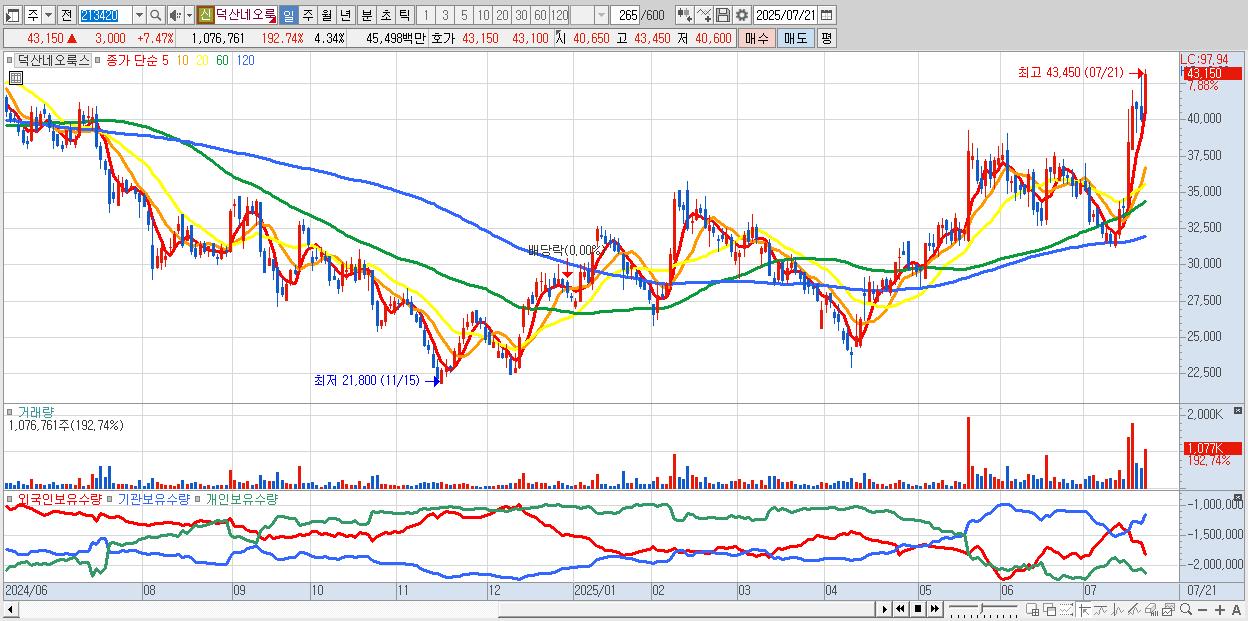 - 덕산네오룩스 (42,700원 ▲ 6.35% , 시총: 10,603억, 거래량: 723,600, 거래대금:306억, KOSDAQ)