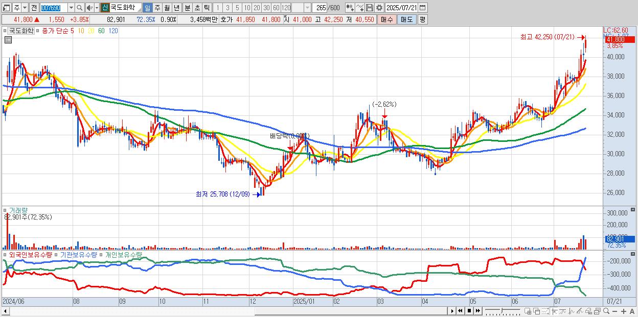 - 국도화학 (41,800원 ▲ 3.85% , 시총: 3,871억, 거래량: 82,901, 거래대금:35억, KOSPI)