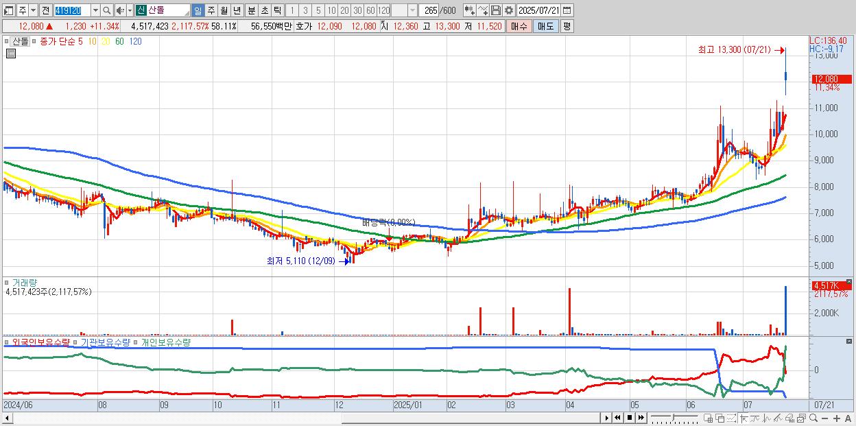 - 산돌 (12,080원 ▲ 11.34% , 시총: 939억, 거래량: 4,517,423, 거래대금:565억, KOSDAQ)