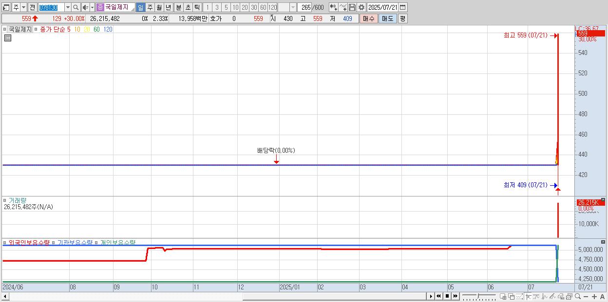- 국일제지 (559원 ▲ 30% , 시총: 6,302억, 거래량: 26,215,482, 거래대금:140억, KOSDAQ)