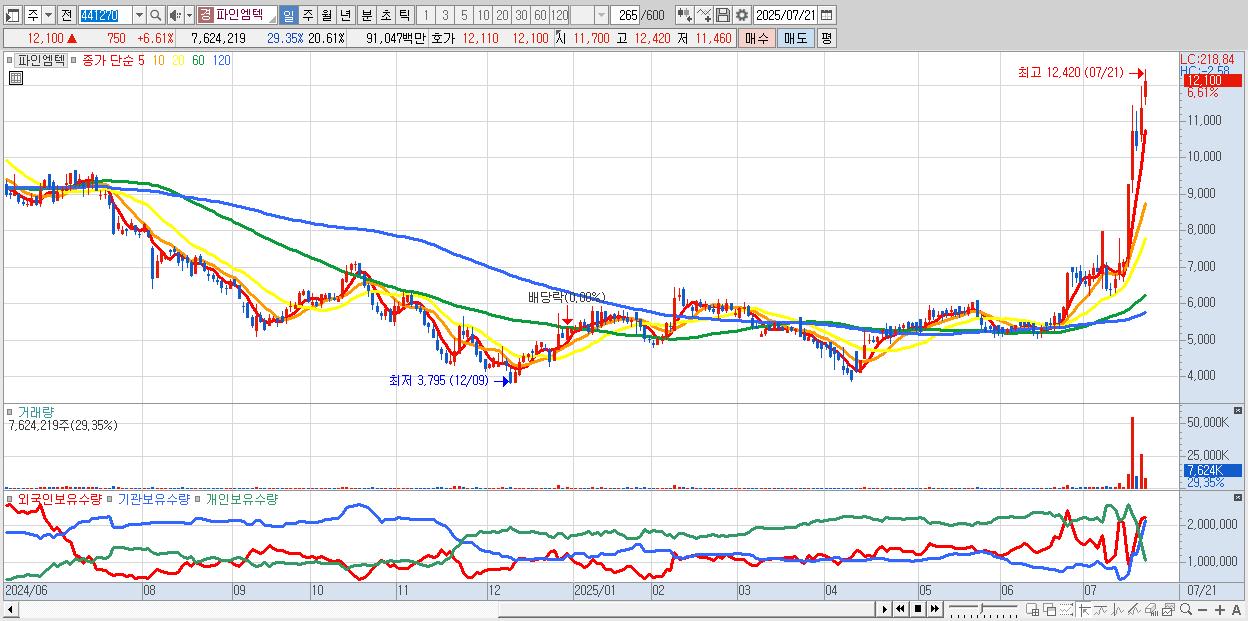 - 파인엠텍 (12,100원 ▲ 6.61% , 시총: 4,476억, 거래량: 7,624,219, 거래대금:910억, KOSDAQ)