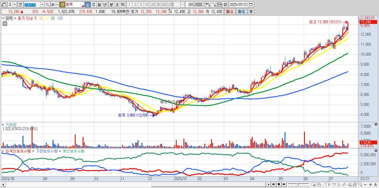 - 원텍 (13,270원 ▲ 6.76% , 시총: 11,939억, 거래량: 913,193, 거래대금:120억, KOSDAQ)