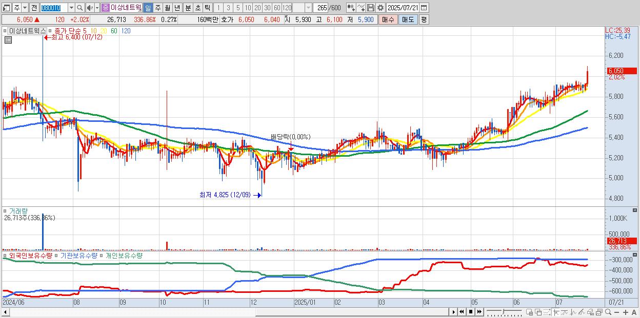 이상네트웍스 6,050원 ▲ 2.02% (KOSDAQ, 080010)
