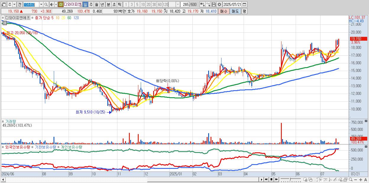 - 디와이피엔에프 (19,150원 ▲ 3.96% , 시총: 2,052억, 거래량: 49,269, 거래대금:9억, KOSDAQ)