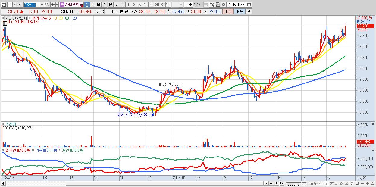 - 사피엔반도체 (29,750원 ▲ 7.99% , 시총: 2,443억, 거래량: 132,574, 거래대금:39억, KOSDAQ)