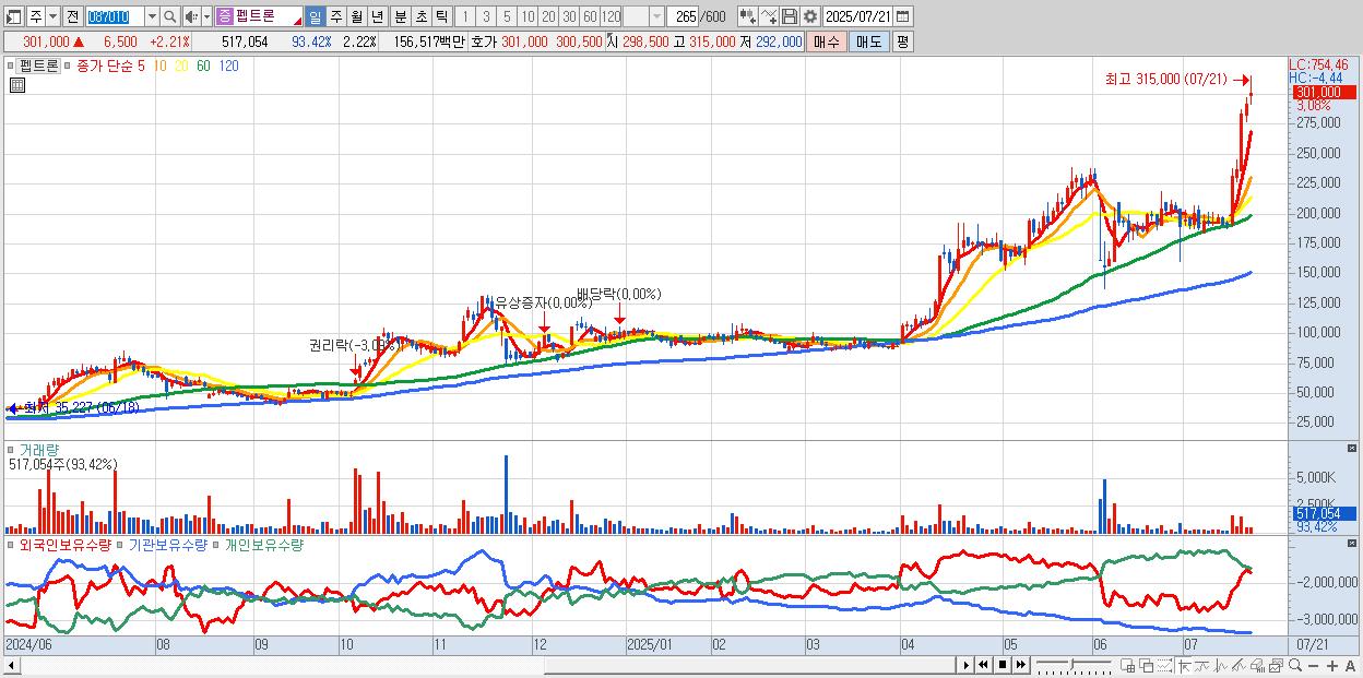 - 펩트론 (301,000원 ▲ 2.21% , 시총: 70,125억, 거래량: 237,835, 거래대금:716억, KOSDAQ)