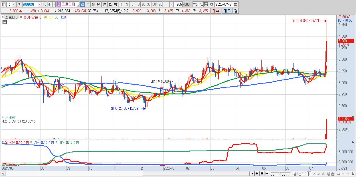 - 프로티아 (3,900원 ▲ 13.04% , 시총: 502억, 거래량: 4,218,354, 거래대금:170억, KOSDAQ)