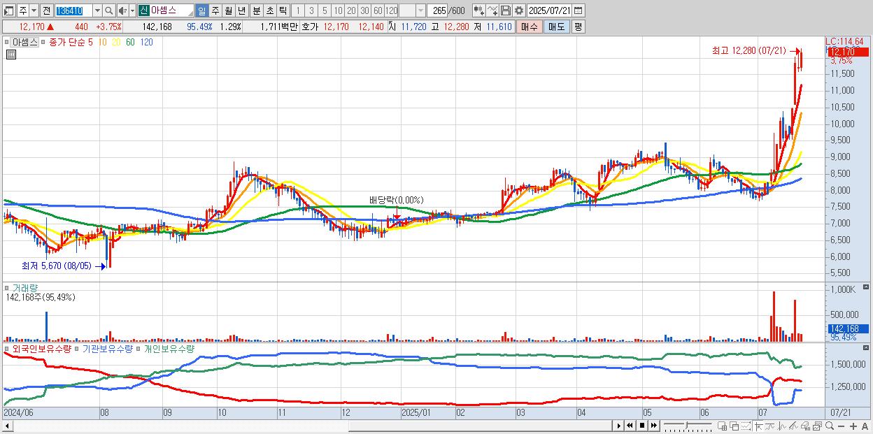 - 아셈스 (12,170원 ▲ 3.75% , 시총: 1,341억, 거래량: 142,168, 거래대금:17억, KOSDAQ)