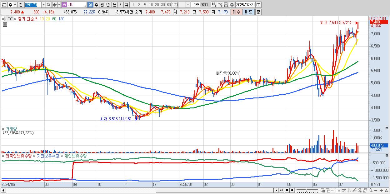 - JTC (7,480원 ▲ 4.18% , 시총: 3,871억, 거래량: 483,876, 거래대금:36억, KOSDAQ)