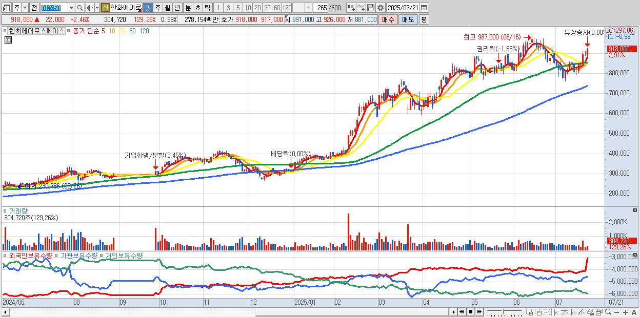 - 한화에어로스페이스 (919,000원 ▲ 2.57% , 시총: 473,868억, 거래량: 224,163, 거래대금:2,048억)