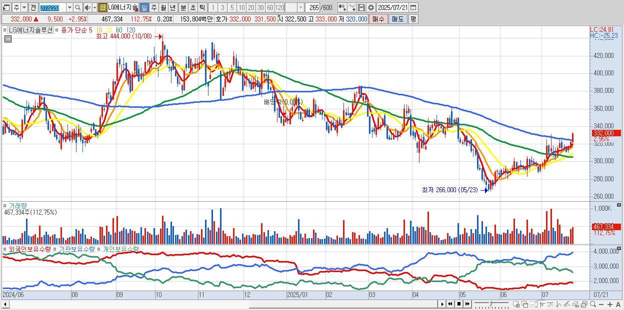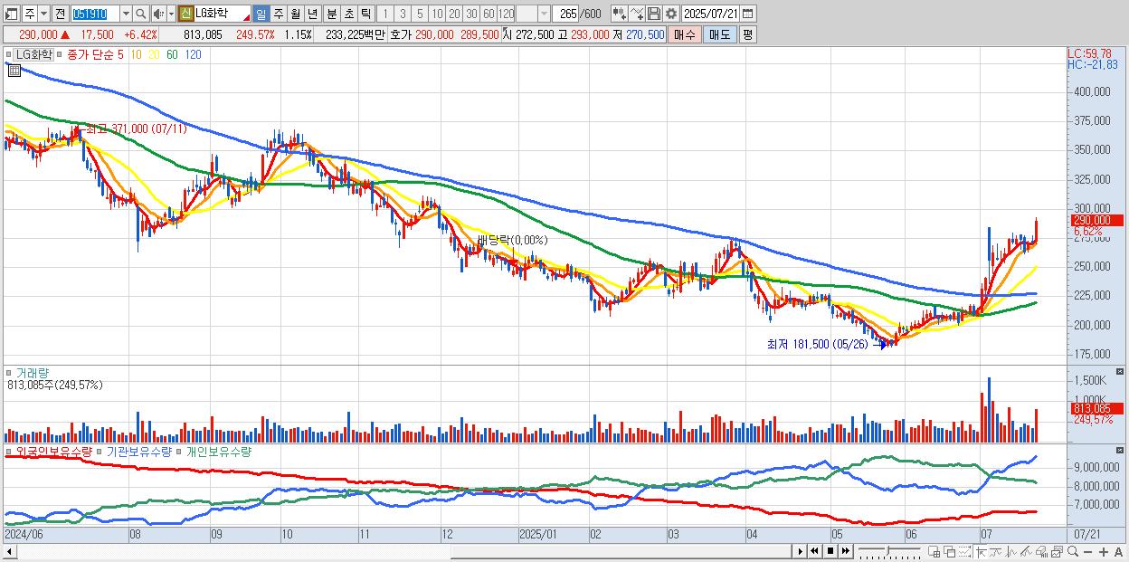 - LG화학 (287,000원 ▲ 5.32% , 시총: 202,600억, 거래량: 575,916, 거래대금:1,653억)