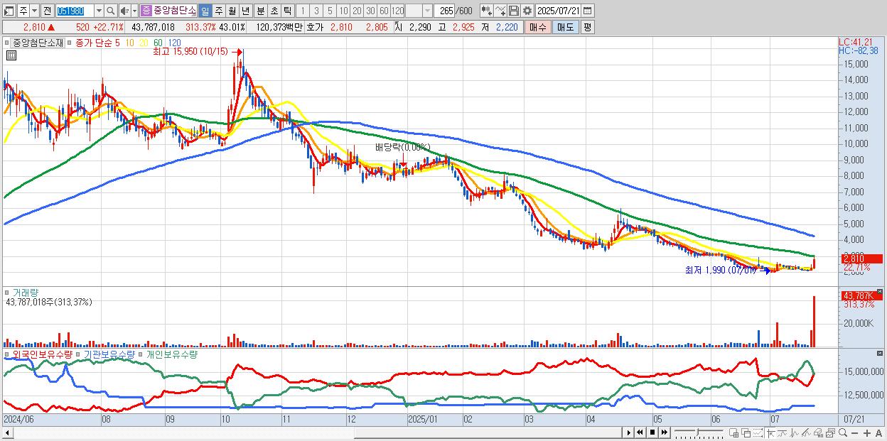- 중앙첨단소재 (2,810원 ▲ 22.71% , 시총: 2,861억, 거래량: 43,787,018, 거래대금:1,204억)