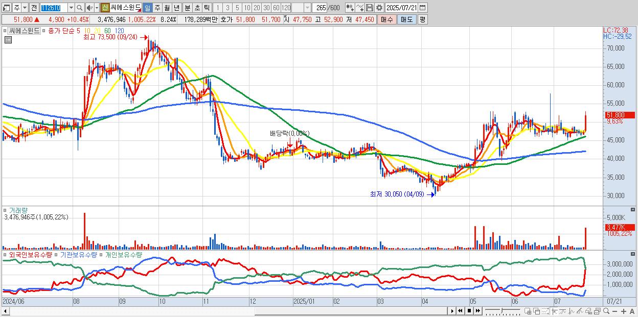 - 씨에스윈드 (51,600원 ▲ 10.02% , 시총: 21,760억, 거래량: 2,142,637, 거래대금:1,099억)