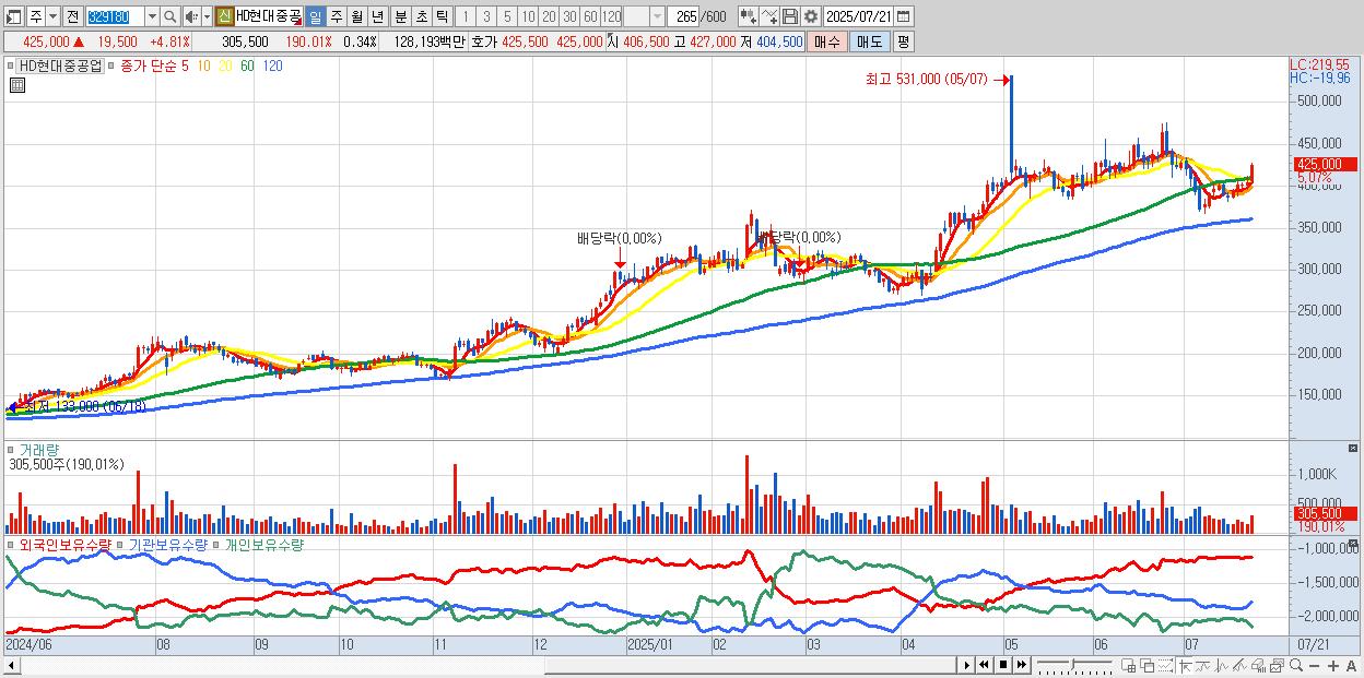- HD현대중공업 (425,000원 ▲ 4.81% , 시총: 377,286억, 거래량: 227,064, 거래대금:954억)