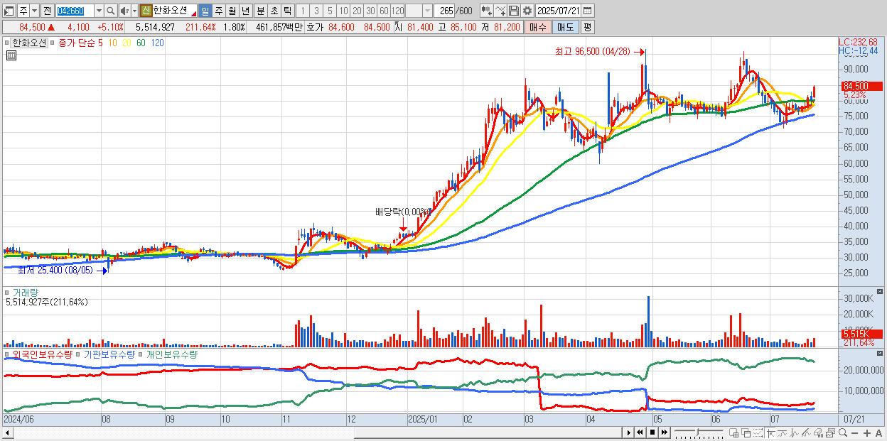 - 한화오션 (84,400원 ▲ 4.98% , 시총: 258,613억, 거래량: 2,654,951, 거래대금:2,229억)
